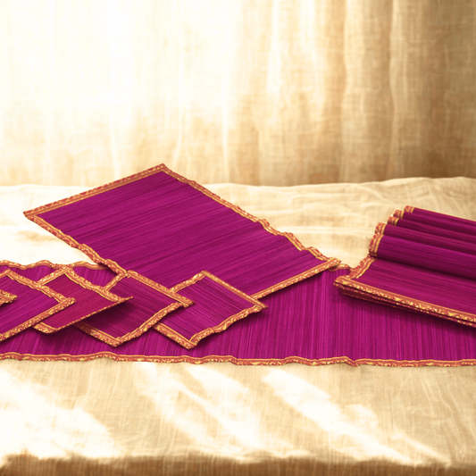 Zari Series | Bamboo Table Runner with Placemats - Pink with Rose Zari Finish