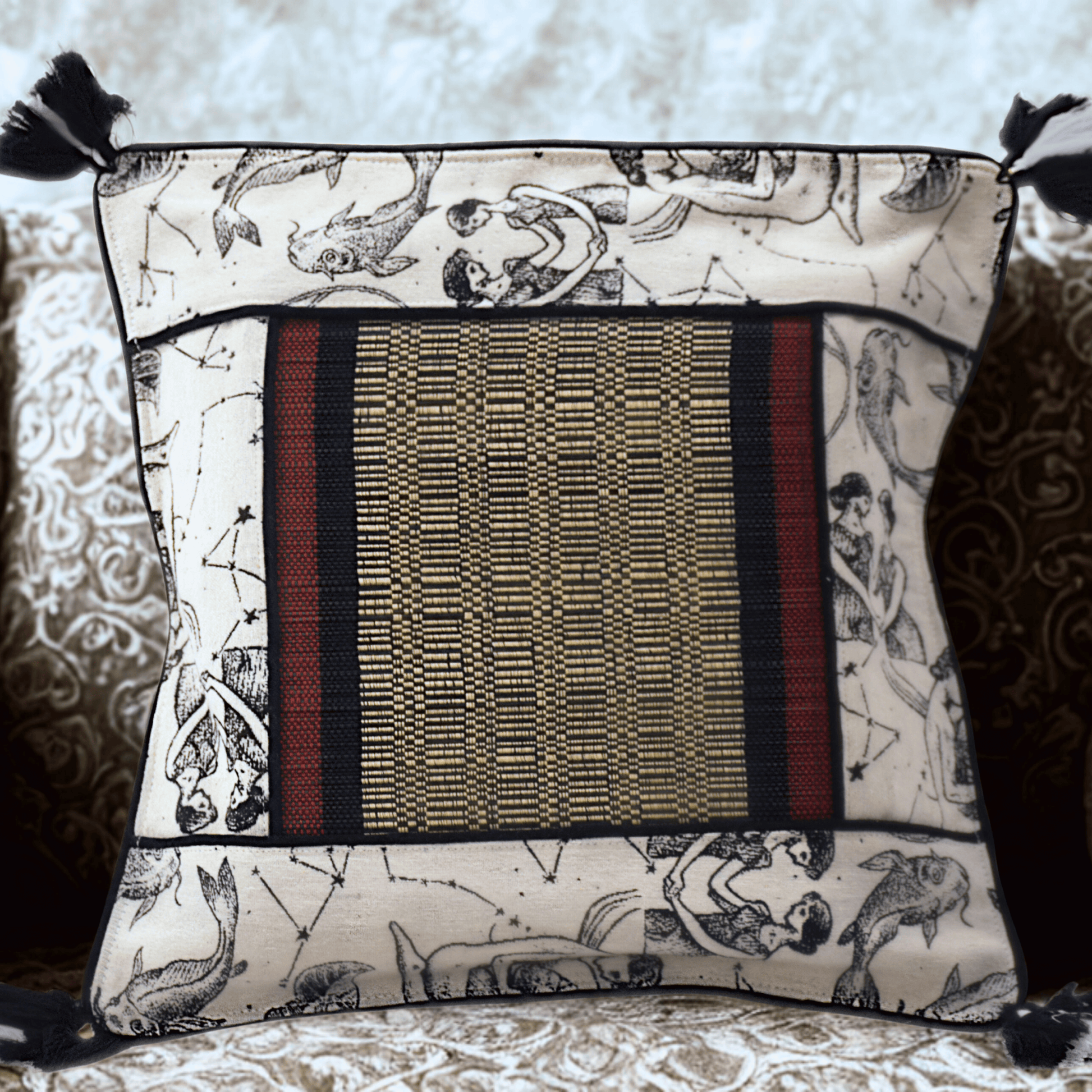 Bold monochrome bamboo cushion with tribal-inspired funde detailing for contemporary homes.