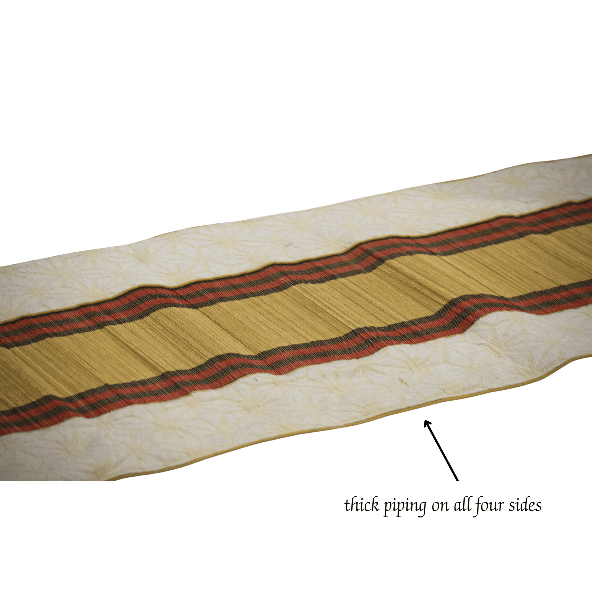 Crafted from handwoven bamboo in a refined snowflake weave, this bed mat is elevated with subtle Muga gold piping and handcrafted funde detailing. Designed to introduce warmth and tactile comfort, it blends traditional craftsmanship with contemporary living spaces.