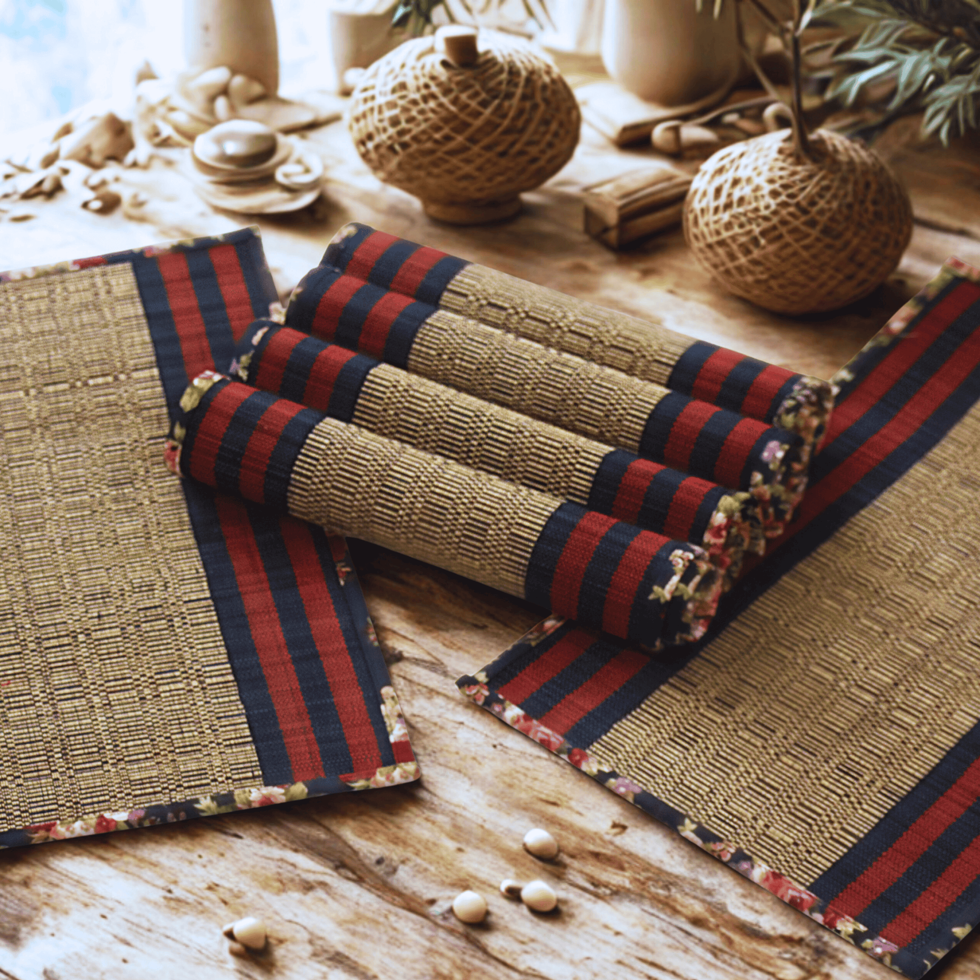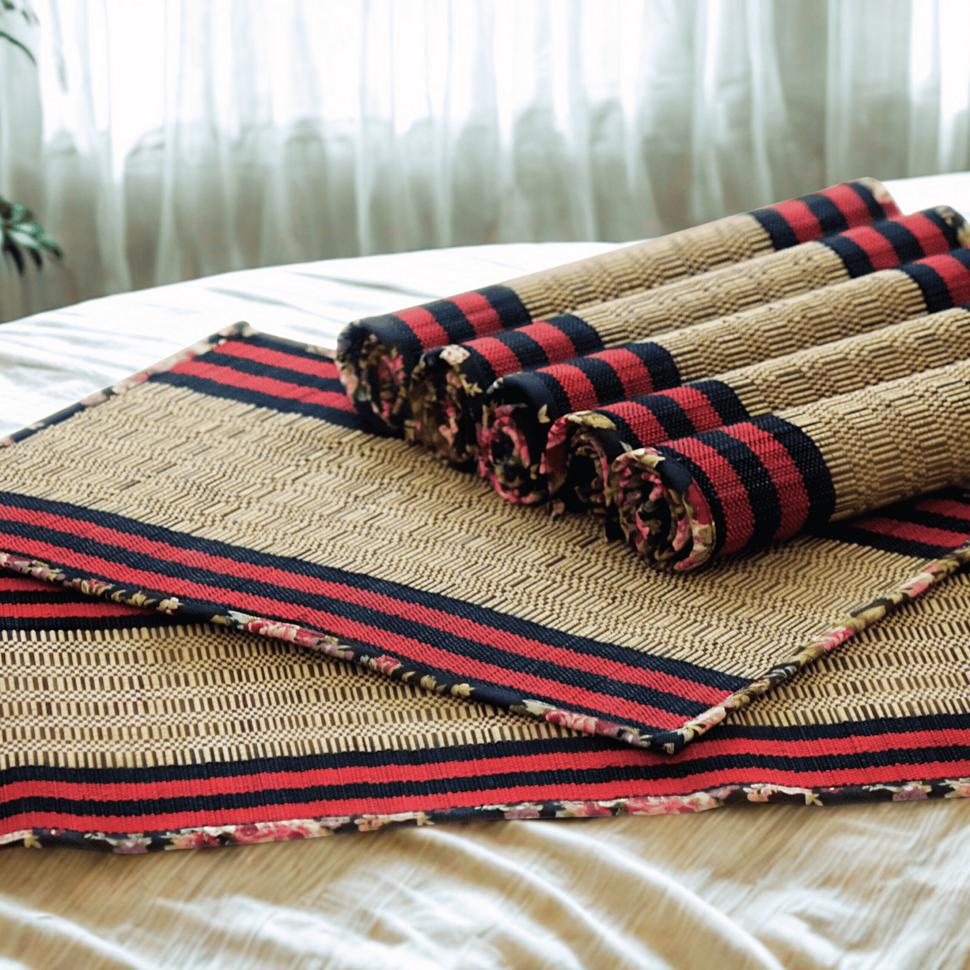 Minor variations in weave, colour, and thread placement are inherent to handcrafted bamboo textiles and enhance their authenticity.