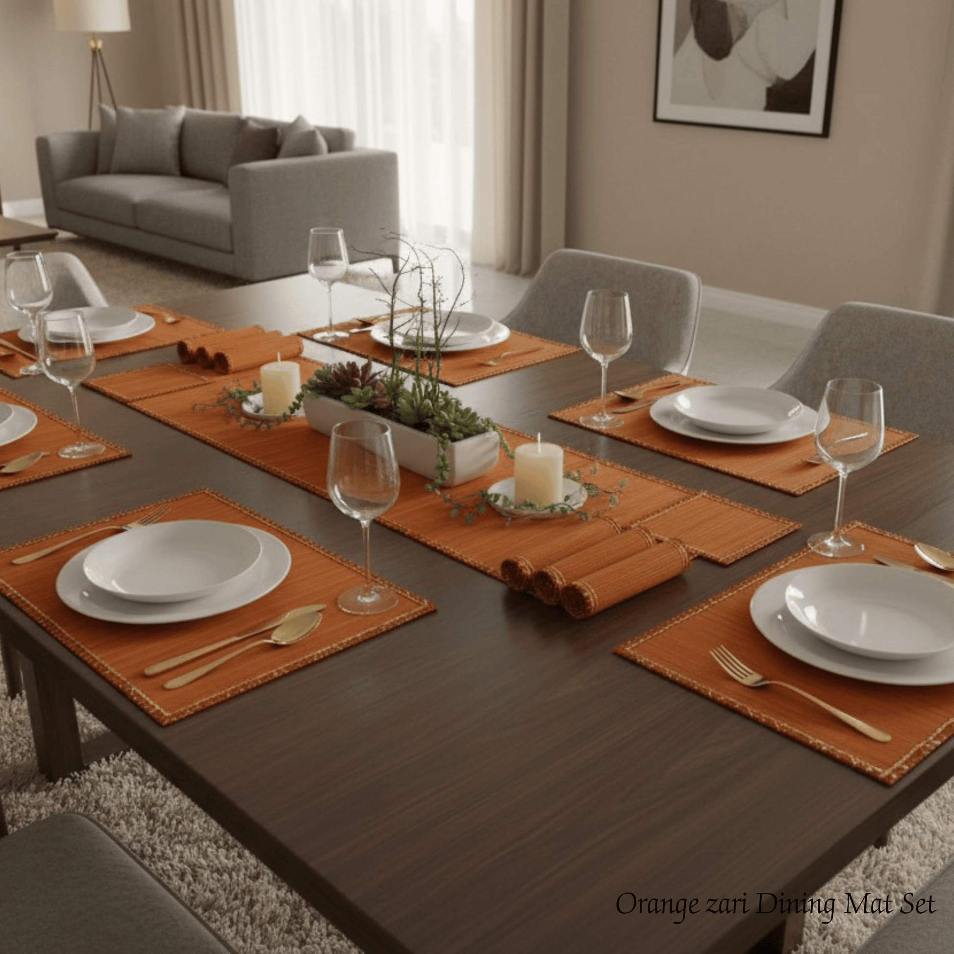 Zari Series | Bamboo Table Runner with Placemats - Orange with Marigold Zari Accents